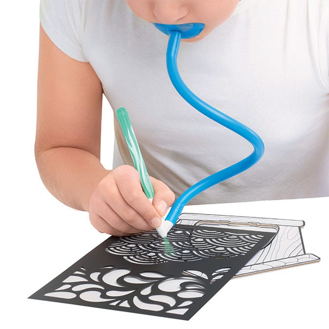 Le Blowpen Art est un système d’aérographie simple à utiliser : l’enfant souffle dans l’embout qui est relié à une buse où se trouve un feutre.