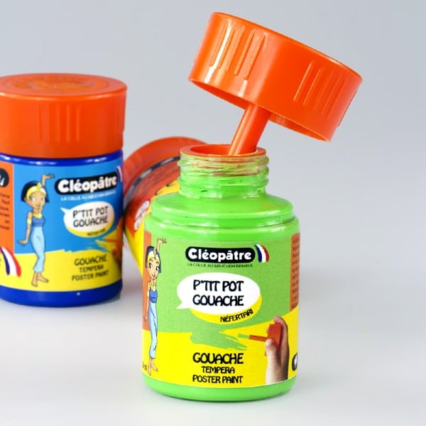 - La forme du pot est directement inspirée de celle du célèbre P’tit Pot de colle à l’odeur d’amande, qui fait partie de l’ADN de Cléopâtre. Le bouchon du P’tit Pot de gouache va aider l’enfant à développer la prise palmaire (à pleine main), en vue de l’apprentissage de l’écriture. Cela va également lui permettre de renforcer sa concentration et sa motricité fine.